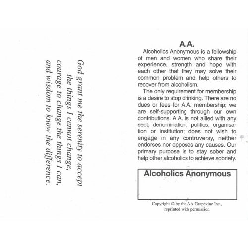 Wallet Card containing the AA Preamble, Twelve Steps, Twelve Traditions, and Serenity Prayer
